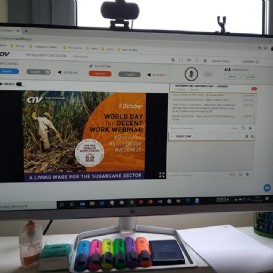 Seminario de formación en línea en la Jornada Mundial por un Trabajo Digno que se celebra el 7 de octubre. Charlas sobre la norma Bonsucro, la plataforma financiera por el salario digno, el sector del azucar, etc. Interpretación remota ing-esp-ing.